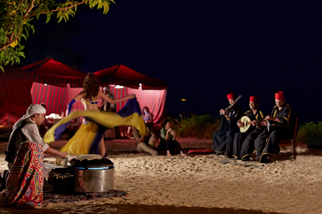 Many resorts organize evening safaris that include a drive across the desert to a Bedouin village. Upon arrival, guests are greeted with tea, freshly baked bread, and warm hospitality. As the night deepens, the camp comes alive with traditional Bedouin music, belly dancing, and fire shows.
